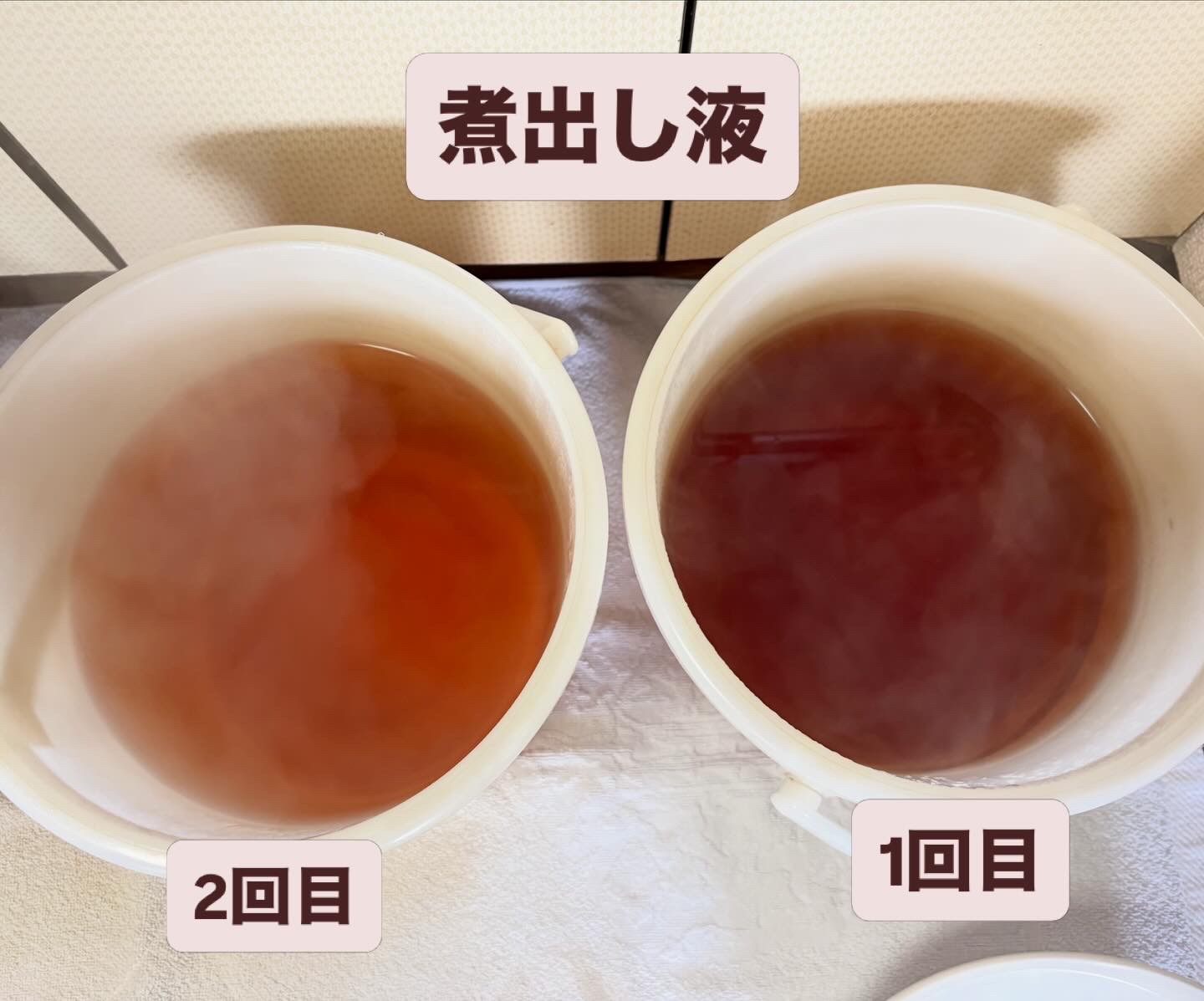 1回目の煮出し液は、茶とピンクが混ざったような濃い色。